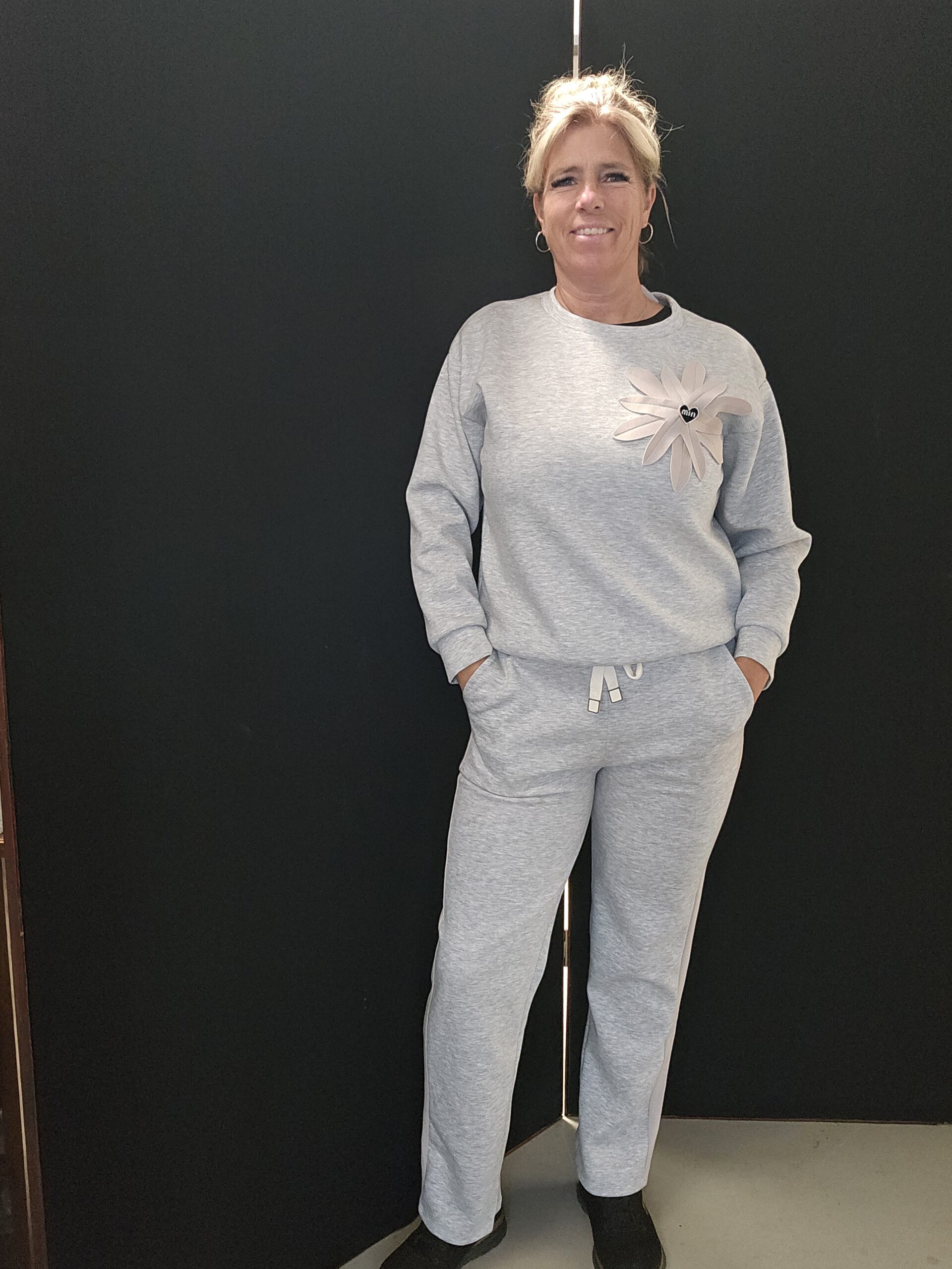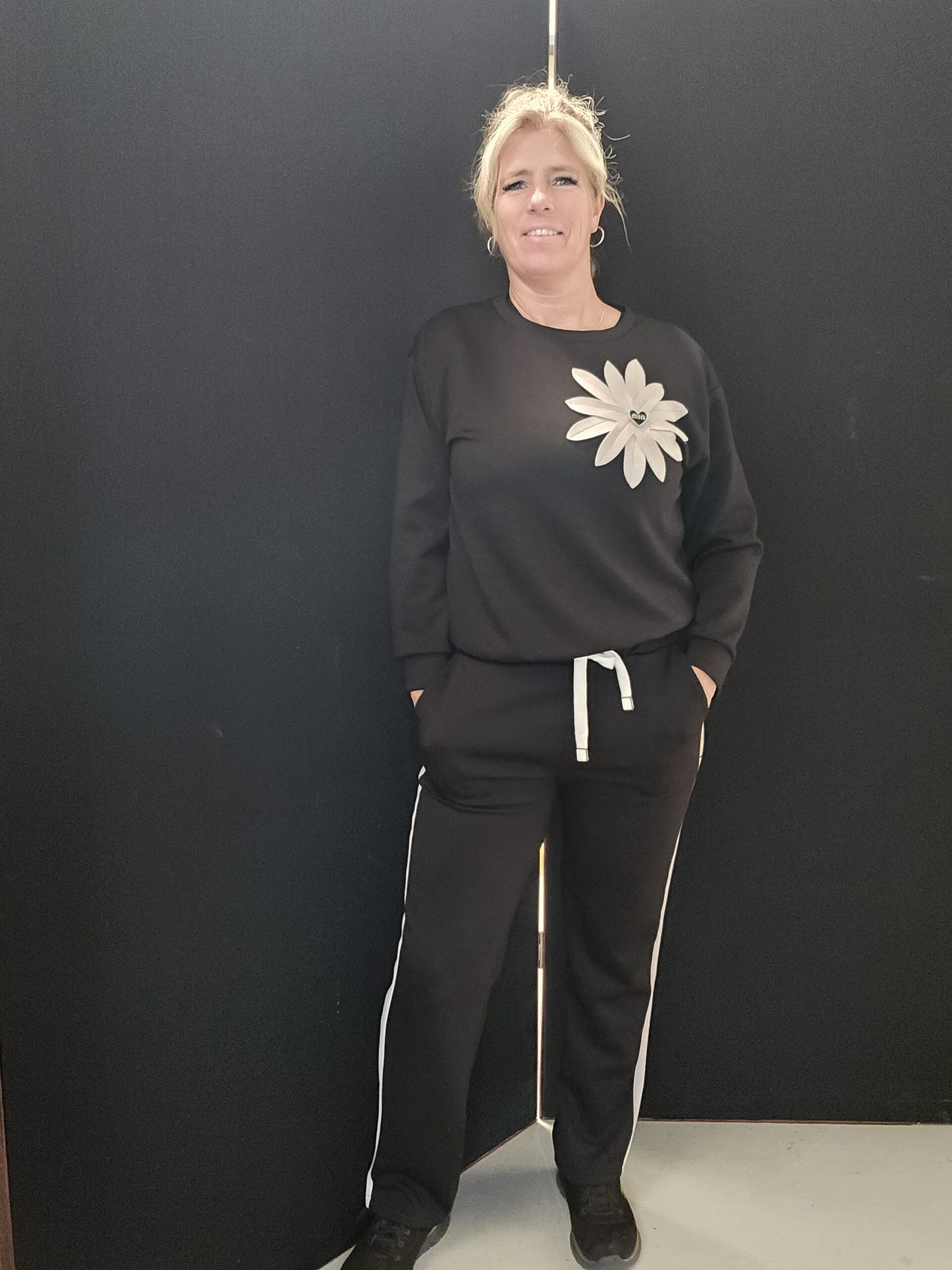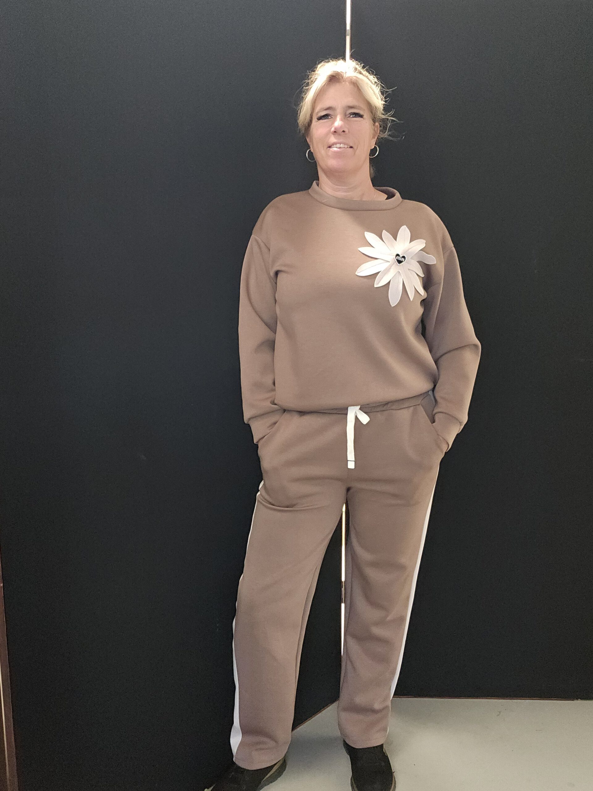 Jasje valt ruim met stretch en een tijgerprint streep op het jasje en broek met steentjes erop.