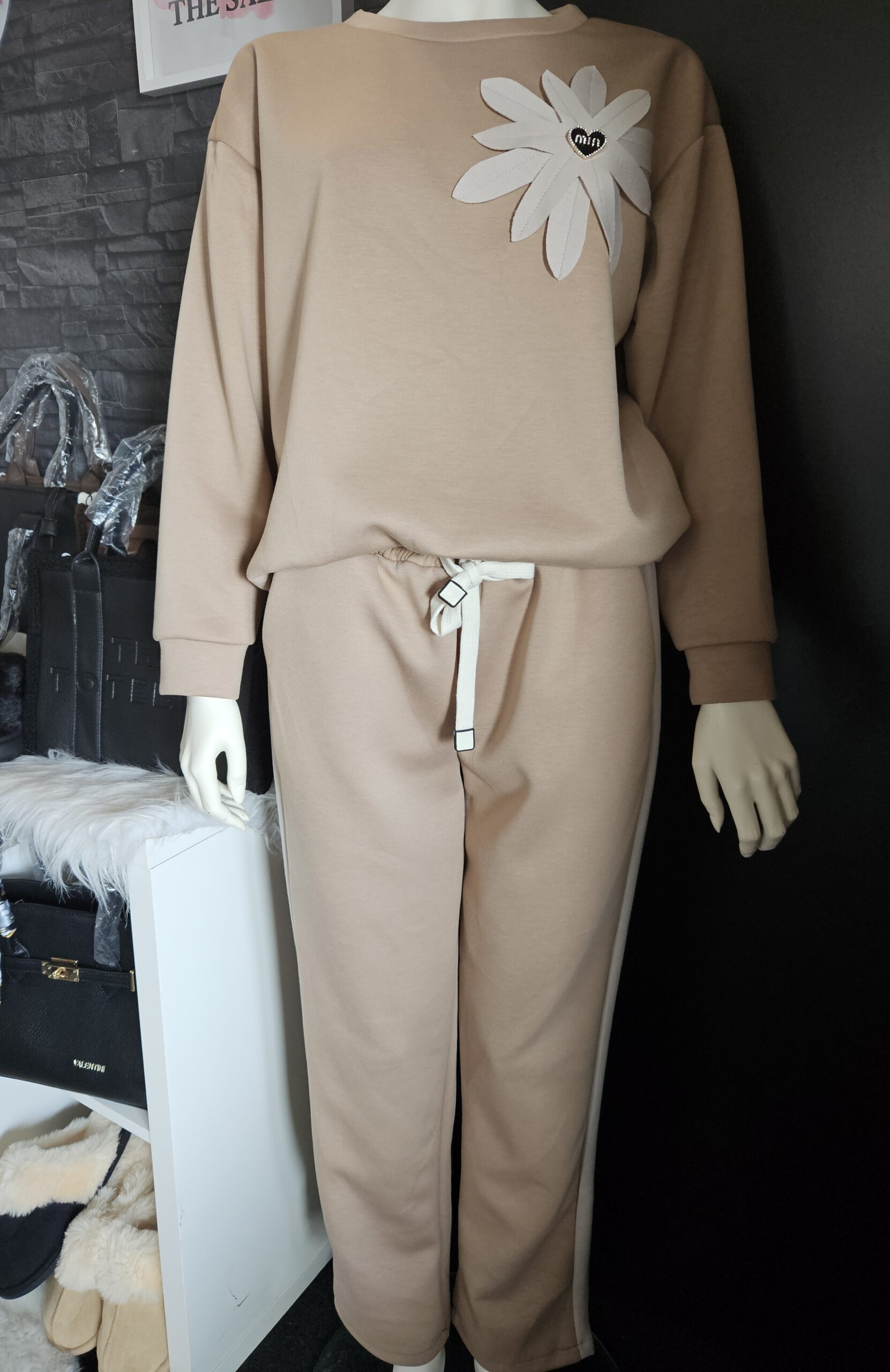 Jasje valt ruim met stretch en een tijgerprint streep op het jasje en broek met steentjes erop.