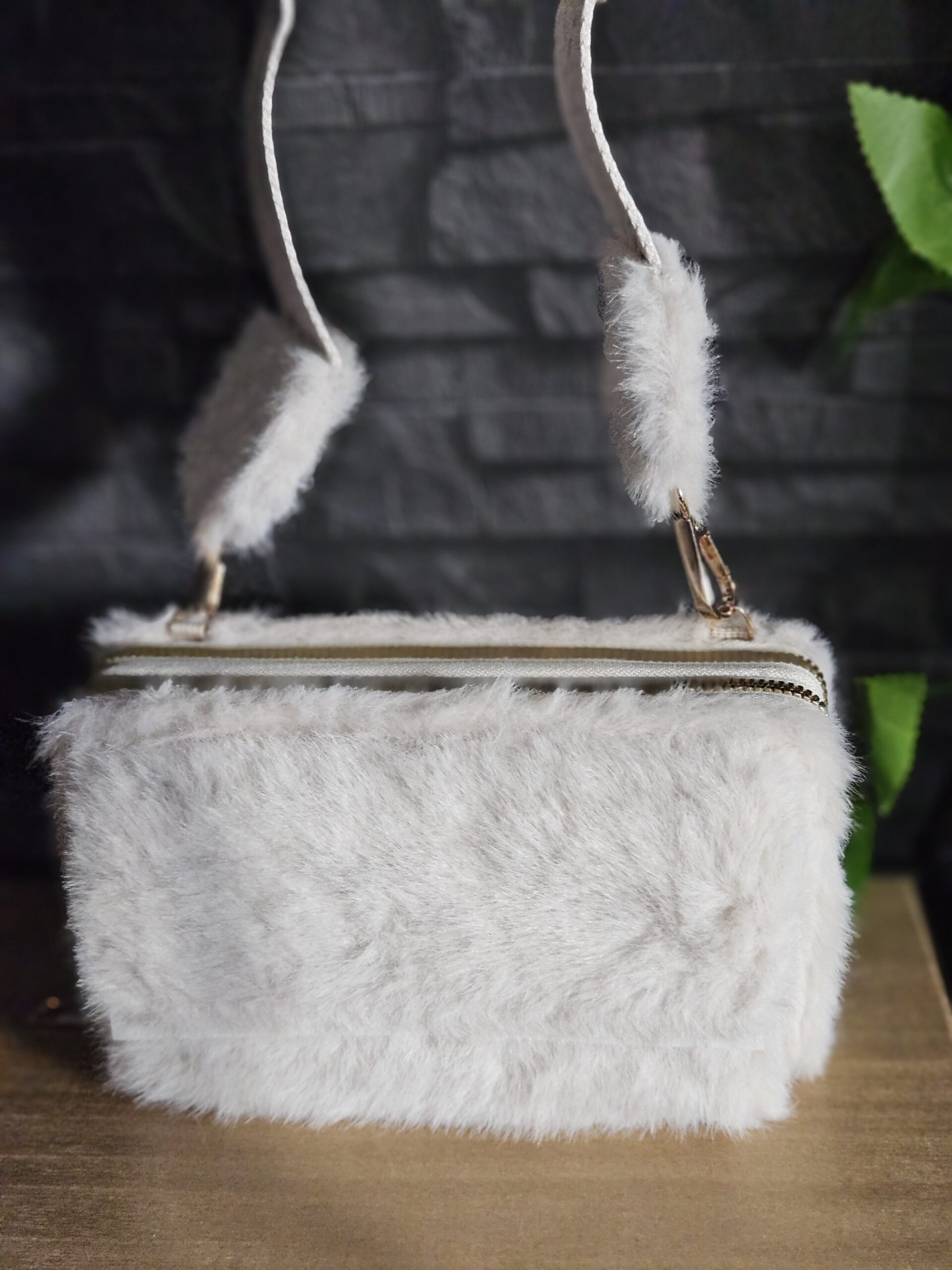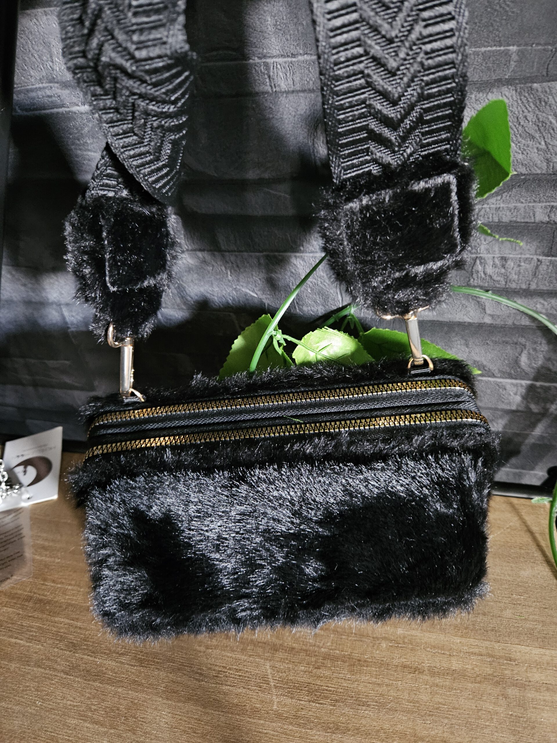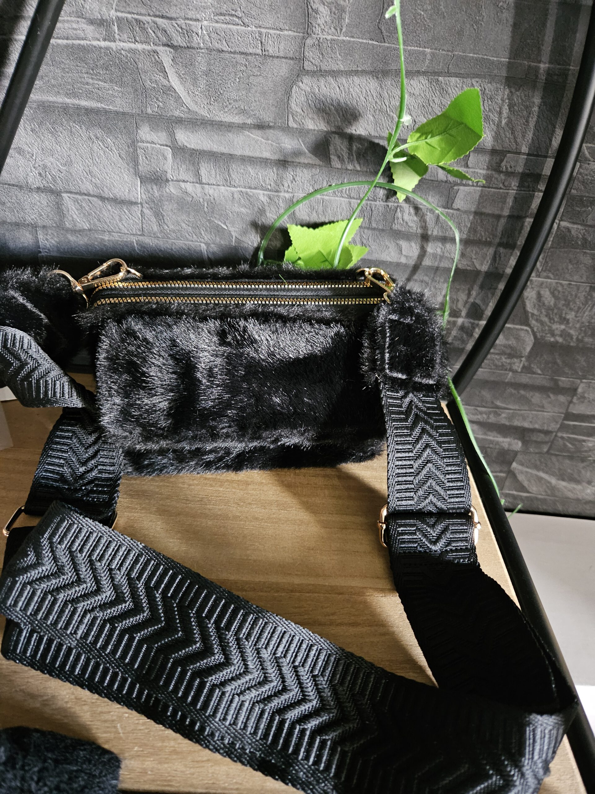 Een leuk tas en beurs inĀ de vorm van een tasje in fluffy stof ,met een band om om te hangen .